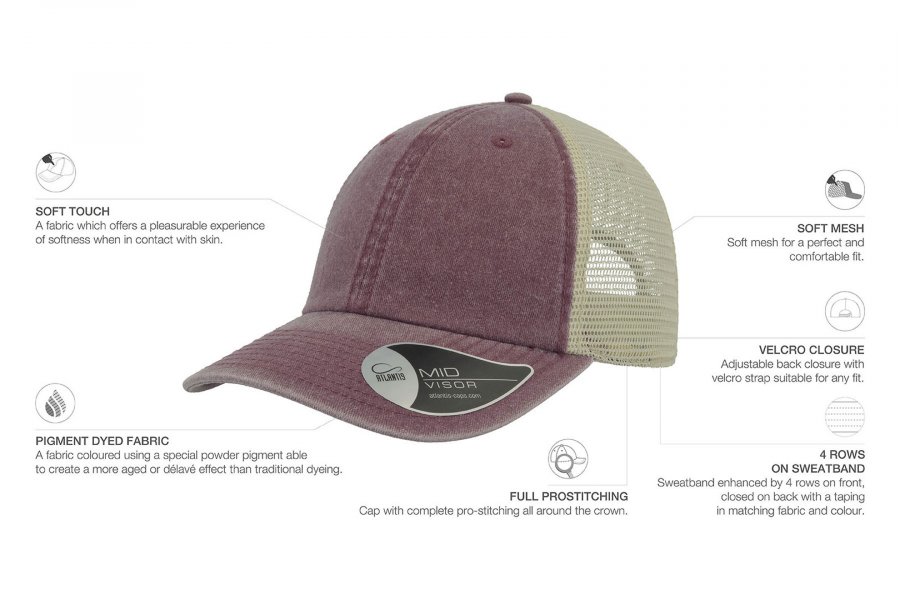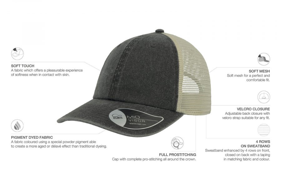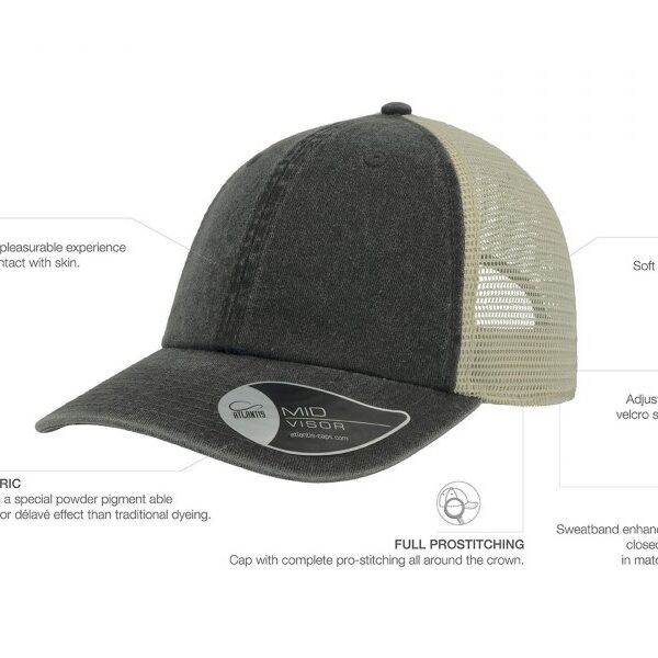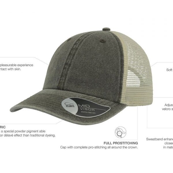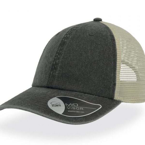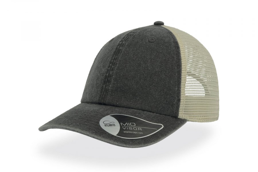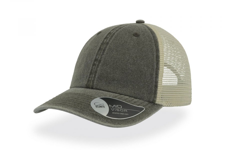 Vintage капа со состав 100% памук на предните панели, и мрежа на задните со состав 100% полиестер, со чичак трака