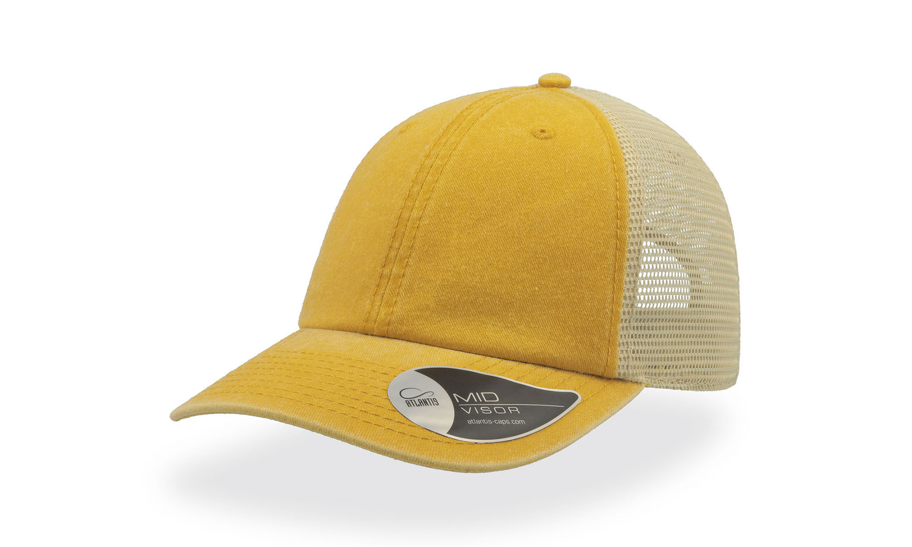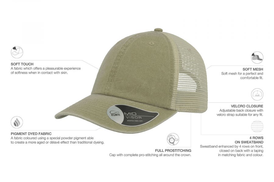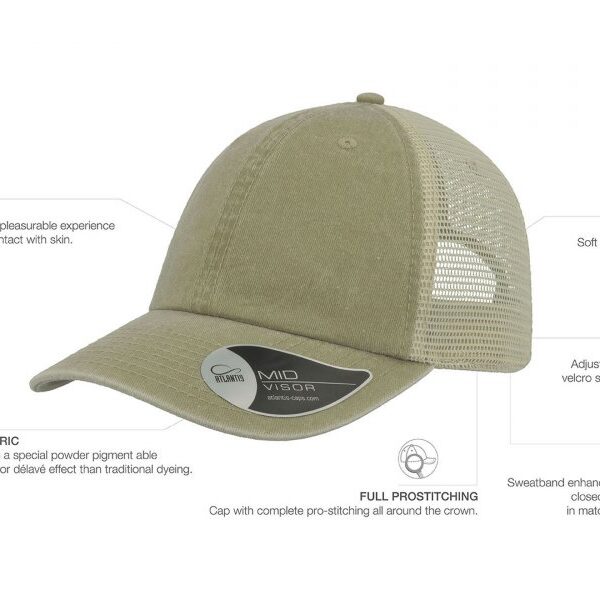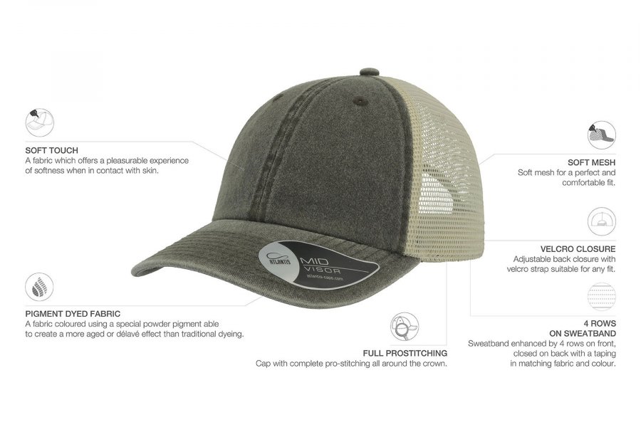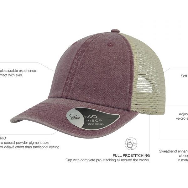 Vintage капа со состав 100% памук на предните панели, и мрежа на задните со состав 100% полиестер, со чичак трака
